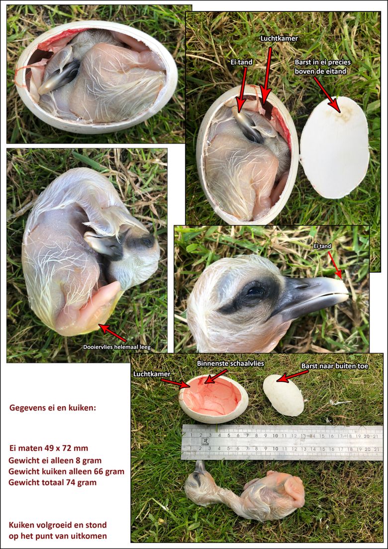 Toen ik boven het nest uitkwam zag ik één hulpeloos verlaten ei liggen. In een kleddernat nest en het ei was ijzig koud, de ooievaars waren ook al meerdere dagen beiden van het nest. Tussendoor af en toe wel een op het nest. Ik heb het ei meegenomen en aan de bewoners laten zien. Ik ga dit voor jullie thuis even open maken en kijken wat erin zit. Tot mijn verbazing zag ik dat er van binnenuit ook al een barst in het ei zat, een barst die van binnen naar buiten gedrukt was. Thuis aangekomen heb ik (zoals ik al vaker gedaan heb) er een luikje ingezaagd met een freesje. Wat ik al zei heb ik zo al meerdere eieren geopend voor onderzoek, bijv. van steenuilen, kerkuilen, wespendief enz. allemaal verlaten of niet uitgekomen eieren. Maar toen ik dit ei opende werd ik toch bijna een beetje emotioneel moet ik eerlijk bekennen. Er zat een kant en klaar jong in het ei, wat eigenlijk bezig was om uit het ei te kruipen, maar door dagen niet meer verwarmd te worden door de ouders, is het kuiken in het ei gestorven. Bekijk de foto’s maar eens goed, de barst zit precies op de plek waar de zichtbare eitand van het kuiken zit. Ik heb bewust eerst foto’s gemaakt van het geopende ei, zodat je kan zien hoe zo’n kuiken daadwerkelijk in een ei verpakt zit. Daarna het ijskoude kuiken eruit gehaald en wat uitgevouwen en dan zie je dat het kuiken al 13cm lang is en het ei maar amper 8 cm. Je zou het kuiken zelfs niet meer terug in het ei krijgen, zo mooi zit dat kuiken in elkaar gevouwen in het ei. De dooier zak was helemaal leeg, wat betekend dat het voedsel in het ei op is en het kuiken eruit moet, het had zelfs de ogen al open. Ook de eigenaar heb ik later de foto’s gestuurd, en gezegd dat het erg jammer is. Het mannetje van dit nest was niet geringd, het vrouwtje echter wel. Ze draagt een groene ring met 4 witte letters, ik ben nog bezig deze te achterhalen, wat ik al wel weet is dat het een Franse vrouw is.