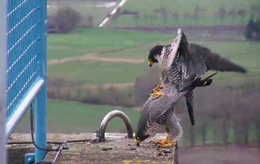 Het mannetje en vrouwtje zijn al enkele weken druk aan het baltsen en paren (copuleren). In het begin zoekt zij al toenadering tot het mannetje maar hij durft dan nog niet zo goed. Dit is ook best wel gevaarlijk, een vrouwtje kan een mannetje makkelijk doden als het niet “klikt”. Het mannetje gaat steeds meer prooien brengen en probeert haar zo voor zich te winnen. Het vrouwtje heeft ook veel voedsel nodig in dit stadium want ze moet in optimale conditie zijn om eieren te gaan produceren. Door de prooioverdrachten, die zowel in de lucht als op de toren plaatsvinden, vermindert de agressie van het vrouwtje, het verstevigt de paarband en kunnen de paringen beginnen. Deze paringen duren maar enkele seconden en vinden meerdere keren per dag plaats en gaan door tot het laatste ei is gelegd.