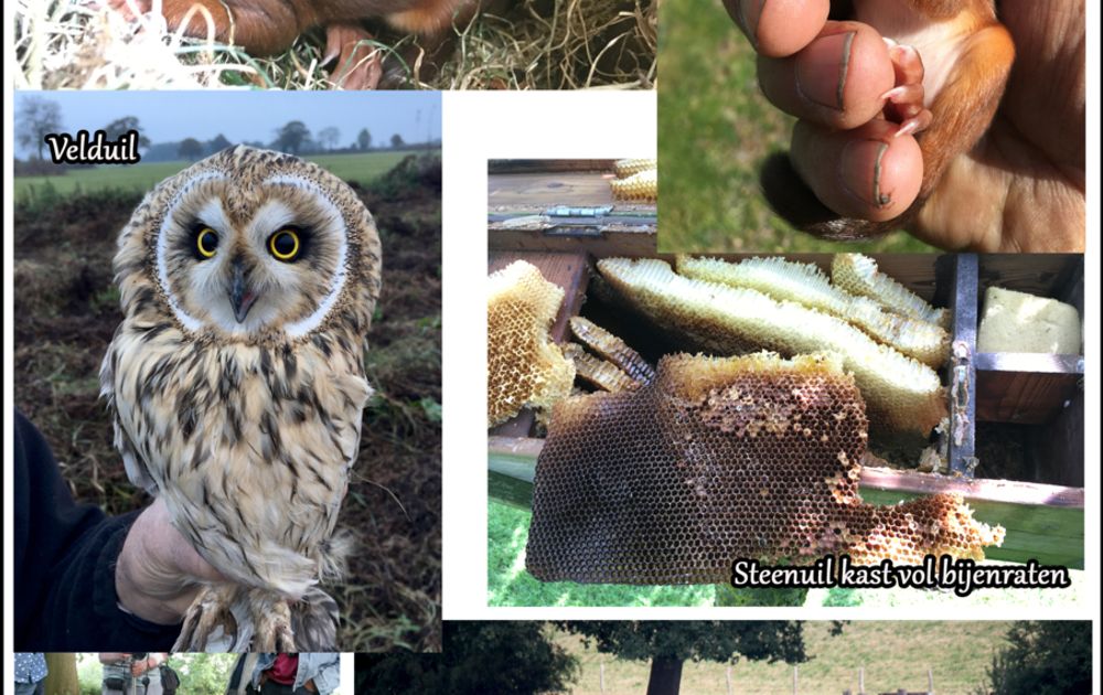 Zo troffen we een keer een heel raar nest aan bij de controle van steenuilkasten. Het bleek het nest van een eekhoorn met, ik meen 5 jongen, prachtig om te zien. Maar ook een, in vlasdraad verstrikt geraakte, velduil hebben we bevrijd geringd en vrijgelaten. Super mooie vogel zeg.