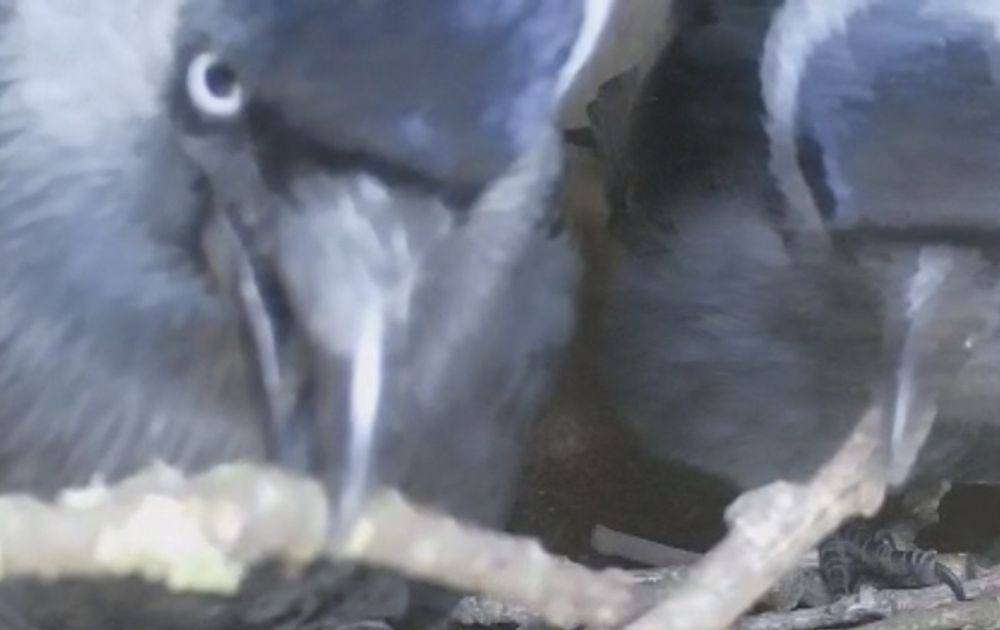 Daarover gesproken: sommige kijkers maken zich zorgen of we straks nog wel wat kunnen zien nu de takken zo hoog opgestapeld liggen. Het zicht wordt er inderdaad niet beter op, dat moet ik zeker toegeven. Maar de bouw is nog niet klaar. De nestkom zelf – feitelijk het belangrijkste onderdeel – moet nog gemaakt worden. Anders dan de jongen van hun steenuilenburen, kruipen jonge kauwen poedelnaakt uit het ei. Bloot tot op de kont. Waar een pasgeboren steenuilenjong als het ware zijn eigen nestkommetje meeneemt in de vorm van een isolerend donskleed – is een jonge kauw afhankelijk van wat zijn ouders aan warm nestmateriaal aan weten te slepen en tot een kommetje weten te draaien.