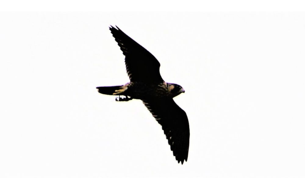 De foto boven is van Yelena. Zij kent de slechtvalken voor het eerste jaar en had het geluk dat er een slechtvalk dichtbij in een boom landde met prooi. Ze kon inzoomen op de pootring en zag dat het EXO was.