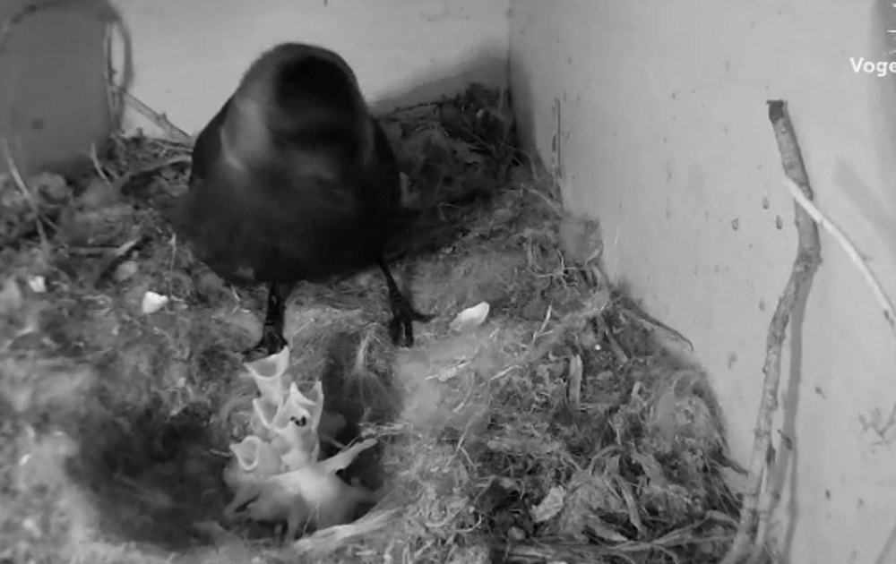 In anderhalve dag is er flink wat veranderd in de kast. Eergisteren, donderdag 3 mei, zat ma kauw nog op 5 eieren. Sinds vanmorgen heeft ze vijf kauwkuikens onder haar veren. Een nieuwe fase breekt nu aan voor pa en ma. Het broeden op de eieren is voorbij, het (op)voeden van vijf hongere kuikens is begonnen. Dat is nog even wennen geblazen, vanmorgen kieperde ma per ongeluk een van de kuikens buiten het nest (Zie dit filmpje). Dit uitstapje was gelukkig van korte duur.