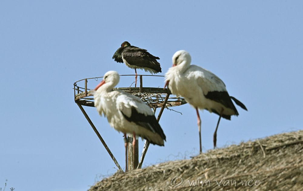 De keuze van de zwarte ooievaar voor het kunstnest in een gecultiveerde omgeving is echt heel opmerkelijk. Toch lijkt hij zich hier helemaal thuis te voelen tussen de witte, ze herkennen de verwantschap. Het samen optrekken ziet er vriendelijk uit, behalve als de twee witte op het nest gaan staan. Die plek is voor de zwarte ooievaar en dat laat hij merken.