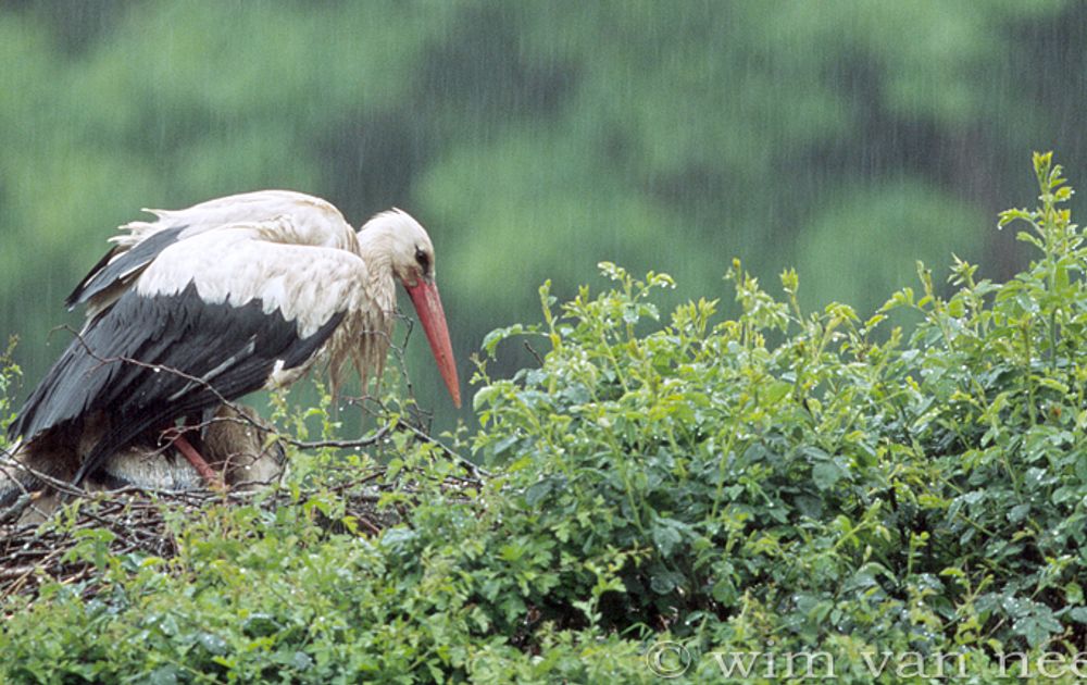 Vanmiddag kwam het met bakken naar beneden. Paadjes in de tuin veranderden in kleine 'rivieren', er kwamen plassen op plekken waar ze anders nooit zijn. Dat kan ook op ooievaarsnesten zijn. Wij spraken eens een nesteigenaar die zijn nest had gevoerd met plastic, om, naar zijn eigen zeggen, het hout te behoeden voor bederf. Het resultaat was dat het nest niet kon afwateren. Jaren achtereen stierven de jongen, want als er water in het nest blijft staan, dan blijven de jongen koud en nat en sterven aan onderkoeling of zelfs verdrinking.