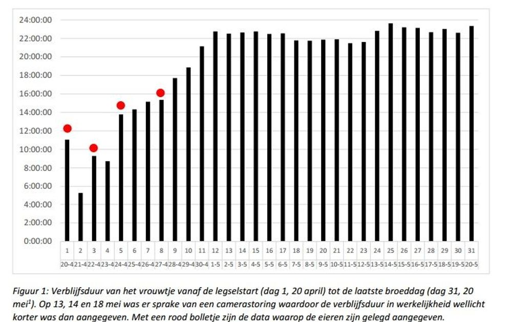 Er is feitelijk niet een duidelijk moment aan te wijzen waarop het broeden daadwerkelijk is begonnen. Vanaf het moment dat ze op 20 april het eerste ei legt, verblijft ze lange tijd in de kast. Ze maakt echter ook nog veel uitstapjes naar buiten. Zowel de frequentie als de totale duur van die uitstapjes nemen af naarmate de tijd vordert (fig. 1). Pas op 1 mei, het laatste ei is dan 3 dagen oud, blijft de totale verblijfsduur buiten de kast min of meer stabiel en zou je kunnen zeggen dat ze vast zit te broeden. Een periode van 20 dagen.