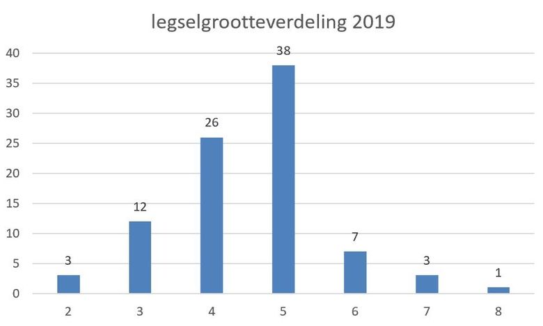 Het zal niet verbazen dat de 5-legsels het vaakst voorkwamen (38 van de 91; zie grafiek) maar we telden ook 7 6-legsels en maar liefst 3 7-legsels; dat zijn bijna evenveel 7-legsels als we in de ruim 30 jaar ervoor bij elkaar aantroffen. Het toppunt was een 8-legsel: dat was voor het eerst in ons langlopend onderzoek.