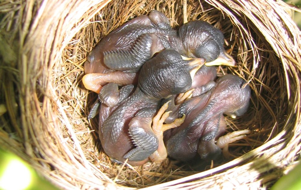 Ongelooflijk zo hard als ze groeien. Ze zijn inmiddels vijf dagen oud en er zitten echt al vogeltjes in het nest. De oogjes zijn al voor een klein beetje open maar ze zijn nog helemaal naakt. Eén ei is niet uitgekomen, dat is niet ongebruikelijk. Het kan zijn dat het onbevrucht is maar nog groter is de kans dat het embryo in een vroeg stadium is overleden. Het ei blijft gewoon onder in het nest liggen en wordt niet verwijderd door de ouders. Binnen een aantal dagen beginnen de eerste veertjes te groeien. Dat moet ook wel want over 6 á 7 dagen verlaten de jongen het nest al.