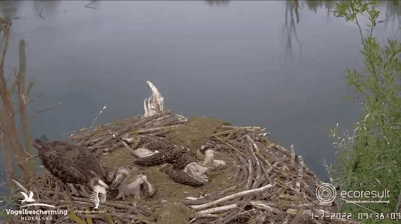 Jonge visarenden zijn niet van de ene op de andere dag klaar voor een zelfstandig leven. Hier gaat een heel proces aan vooraf en dat proces is nu druk bezig. In eerste instantie zorgen de ouders fulltime voor bescherming en voedsel. De gevangen vissen worden verdeeld in kleine hapklare hapjes en de jongen worden gevoerd. Inmiddels zien we onze jongen al zelfstandig eten en happen nemen van aangeleverde vissen. Ook oefenen ze druk met de vleugels. Alles in voorbereiding op de grote dag voor ons als kijkers: het uitvliegmoment.