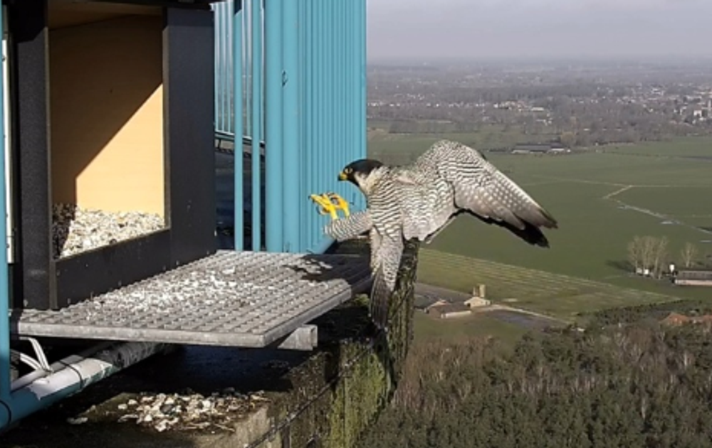 Deze vreemde slechtvalk kan het op haar nestkast gemunt hebben, maar het kan ook een jonge zwervende slechtvalk zijn die kijkt of er iets te eten te halen valt. De slechtvalken bewaren resten van hun prooien op diverse plaatsen op de toren.