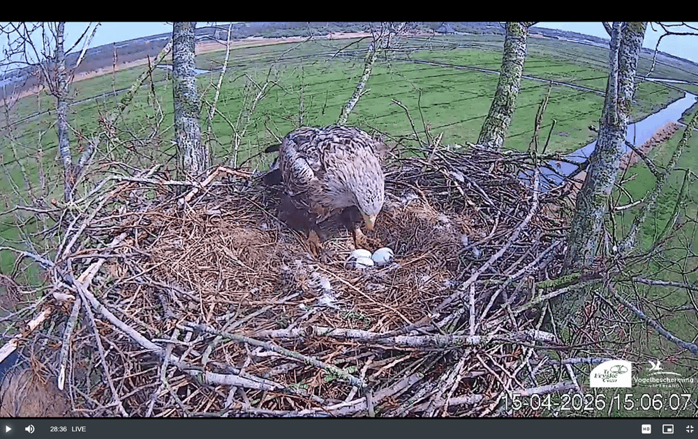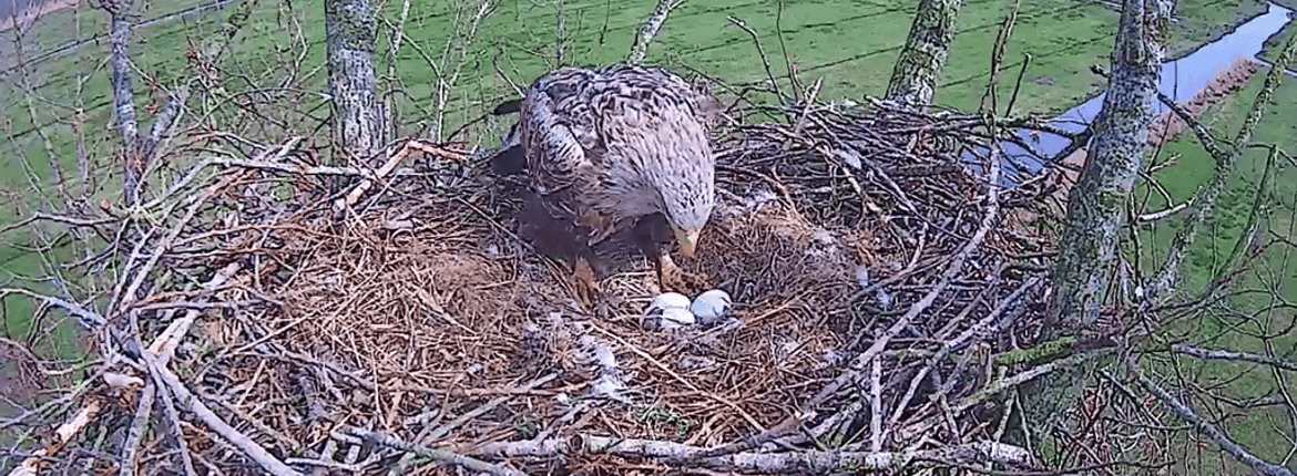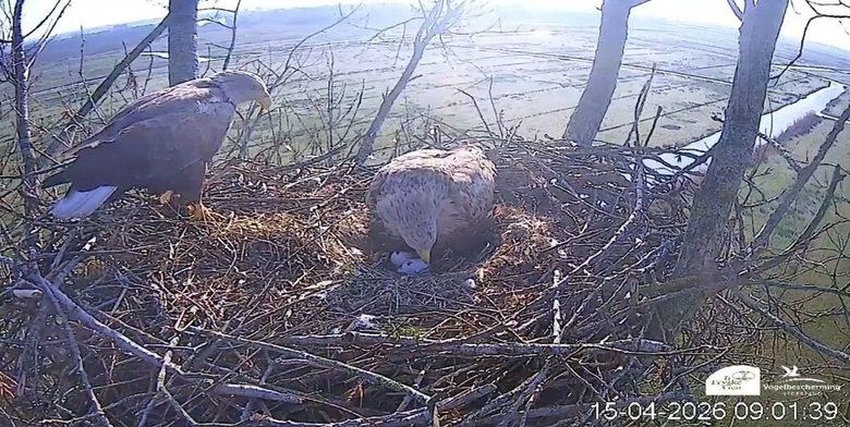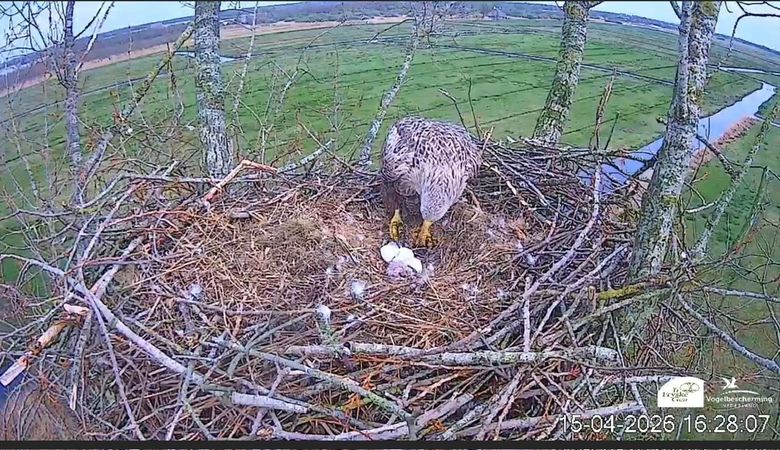 Vanmorgen was het al vroeg onrustig in de zeearend app. Op 15 april om 05:33 uur is duidelijk te zien dat er één ei is aangepikt. Ook is er gepiep hoorbaar. Een aangepikt ei betekent dat het kuiken een luchtgaatje in de eierschaal maakt om te kunnen ademen. Hierna kan het nog tot 24 uur duren voordat het kuiken uit het ei kruipt. Rond 09:00 uur is het opnieuw raak: op de camera is duidelijk te zien dat ook het tweede ei is aangepikt. Nu is het wachten tot ze uitkomen!