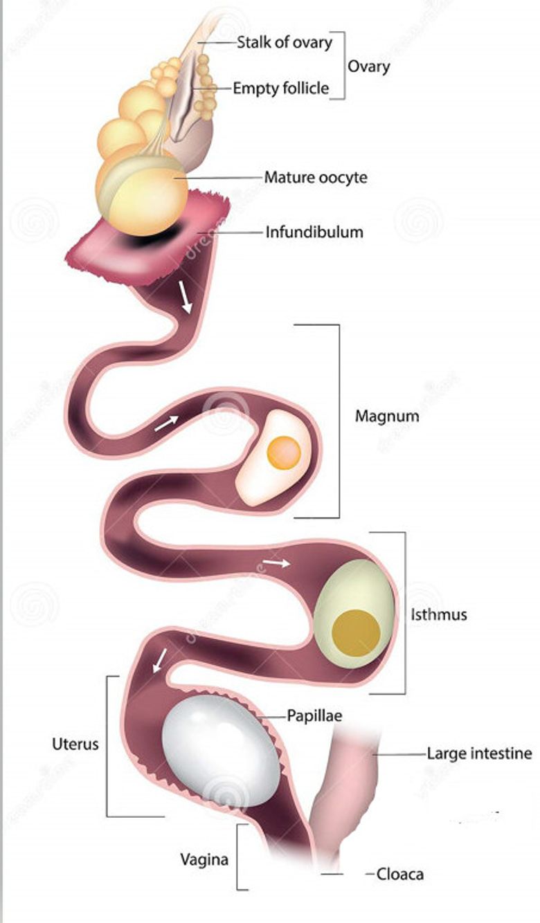 In het blog vorig jaar: de weg van het ei beschreef ik al dat de eicel, na de eisprong, in de eileider terecht komt. In het bovenste deel (het infundibulum) vindt de bevruchting plaats. Daarna worden in het volgende deel (in het magnum) onder andere water, eiwit en mineralen toegevoegd. In het laatste deel (het isthmus) wordt een vlies gevormd. Dit proces duurt enkele uren. Dan gaat het bevruchte ei de schaalklier in (de uterus), waar het groeit door vochttoevoeging en dan een schaaltje en de kleur (pigment) krijgt. Als dat klaar is, na ongeveer een etmaal, passeert het ei de hals van de schaalklier en komt het voor de uitgang, de cloaca. Op bovenstaande afbeelding is dit schematisch weergegeven. Bijzonder is, dat valkachtigen twee eierstokken en eileiders hebben. Verder hebben vrijwel alle vogels één eierstok en eileider.