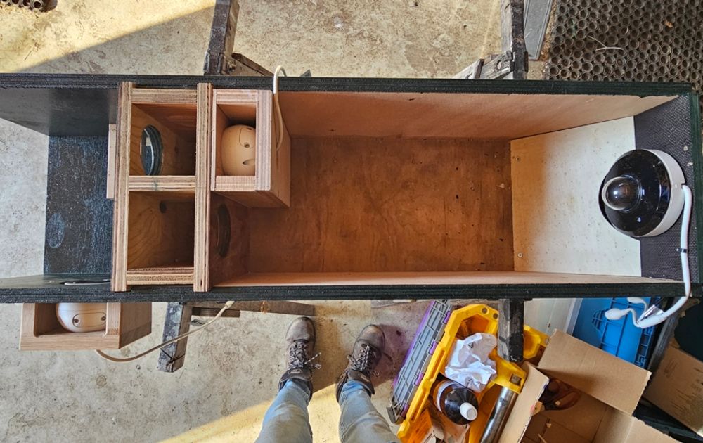 Deze camera (de onderste op de foto) is nieuw ten opzichte van de vorige kast. Hij is vooral van belang voor de registratie van de prooiaanvoer als het via de vlieggatcamera niet meer lukt, of als we een prooi even onder een andere hoek willen bekijken. Hier zien we straks ook de 'gathangers' van dichtbij. Op de beide foto's hieronder zie je duidelijk hoe de invliegcamera en de zijgatcamera ten opzichte van elkaar gepositioneerd zijn. Om de kosten voor het streamen een beetje in de hand te houden (de steenuil is met drie stream toch al een 'dure' soort) is ervoor gekozen de vlieggatcamera en de zijgatcamera in één stream te combineren. Clipmaker en prooitellers zien de camera's achter de schermen overigens wel afzonderlijk.