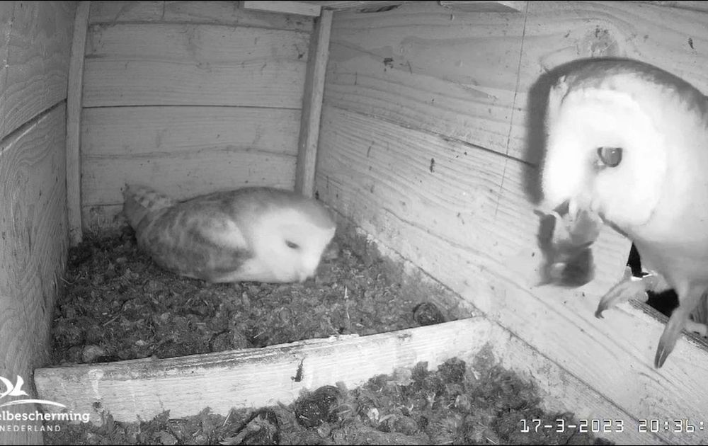 Vorige week zagen we een voorzichtig begin aan deze prooioverdrachten en inmiddels hebben onze uilen de smaak te pakken. Met de toename aan prooioverdrachten zien we ook een toename aan paringen. Allemaal tekenen dat het nu de goede kant op gaat: de aanloop naar de eileg is begonnen. Wanneer het eerste ei precies zal komen, blijft koffiedik kijken. Zelf heb ik in de eipoll ingezet op 24 maart, maar met de kennis van nu vermoed ik dat ik daarmee misschien nét te vroeg zit. Als het zo doorgaat met de prooiaanvoer en paringen hebben we wel een mooie kans om het eerste ei nog in maart te kunnen verwelkomen. De spanning stijgt!