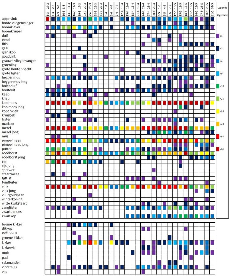 Maar ook heel leuk zijn de vele jongen die door hun ouders hierheen worden gebracht. Vijf jonge koolmeesjes op een rij. Jonge roodborstjes, merels en lijsters.