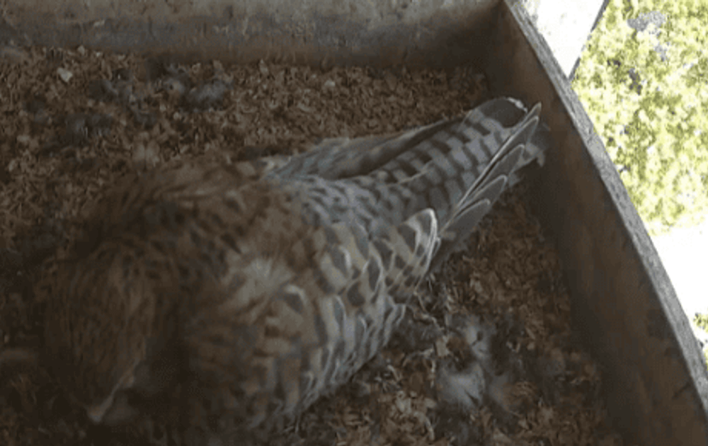 Het vrouwtje broedt de eieren uit. Om het broeden makkelijker te maken te maken ontwikkelen de vrouwtjes aan het begin van de broedperiode een broedvlek. Daar verliezen ze een deel van de veren en is de huid beter doorbloed. Op de webcam-beelden zie je ook dat het vrouwtje regelmatig met de vleugels schudt en heen en weer wiebelt (in BdL-termen ‘schuddelen’) om de eieren zorgvuldig onder zich te houden. En om zeker te zijn dat alle eieren gelijkmatig worden bebroed draait ze zich geregeld om. Ook worden de eieren met name aan het begin van de broedperiode gekeerd voor een goede ontwikkeling van het embryo. Er zijn nu 22 dagen verstreken sinds de leg van het eerste ei. Dat betekent dat het vrouwtje nog zo’n 9 à 10 dagen te gaan heeft voordat het eerste ei uitkomt.