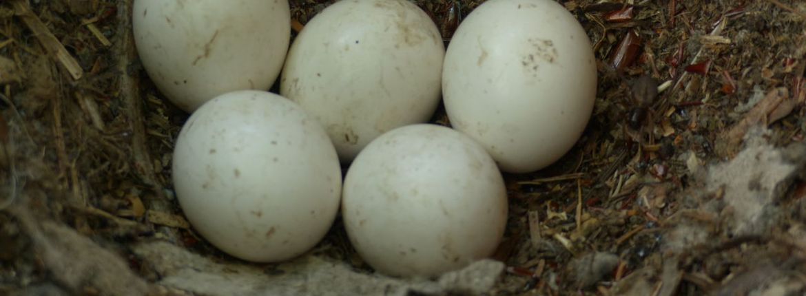 Verwachten we nog een vijfde ei? Niets is onmogelijk maar heel groot schat ik de kans niet in. Het zou dan maandag ergens in de ochtend moeten komen. Gezien de lange tijd tussen het derde en vierde ei kan het ook nog wel eind van middag worden. Waarschijnlijker is echter dat ze vandaag echt met broeden begint en een groot deel van de dag op de eieren doorbrengt. Grote kans dat ze ook vannacht grotendeels binnenblijft. Het eerste jong zouden we dan op 22 mei mogen verwachten. Maar het blijft glazen bol werk, wie weet verrast ze ons opnieuw en ziet het legsel er over twee dagen uit als op de foto.