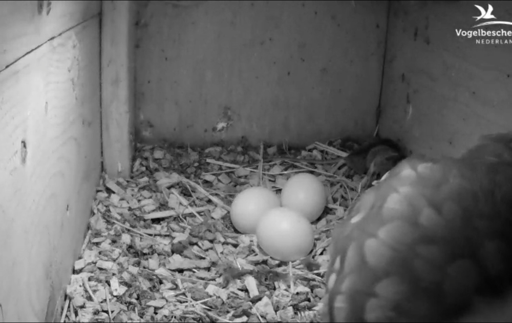 Het viel al op dat het vrouwtje sinds donderdag, in ieder geval overdag, vrijwel onafgebroken in vaste broedhouding op de eieren zit. Dit is doorgaans een teken dat het legsel compleet is of dat er hooguit nog één ei wordt bijgelegd. Het was dan ook niet uitgesloten dat er vanochtend nog een vierde ei zou volgen. Maar dat is dus uitgebleven. Het zou wel een heel grote verrassing zijn als nu nog ....