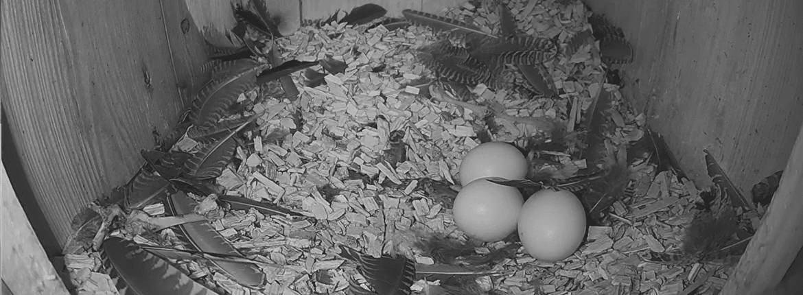 Daar is het helaas iets minder duidelijk. Vrouw bosuil zit veel en lang in de nestkast. De eieren zijn dus ook warm en de ontwikkeling begint al voorzichtig in het eerste ei terwijl het laatste ei nog gelegd moet worden. Wat we wel gaan zien is dat vrouw steeds sneller weer thuis is van een bezoekje naar buiten de kast. We weten inmiddels dat iedere 2 1/2e dag ongeveer een ei gelegd wordt. Dus onze grootste hint hebben we maandagavond gehad. Dan ligt er misschien wel een vierde ei! Of niet ;)