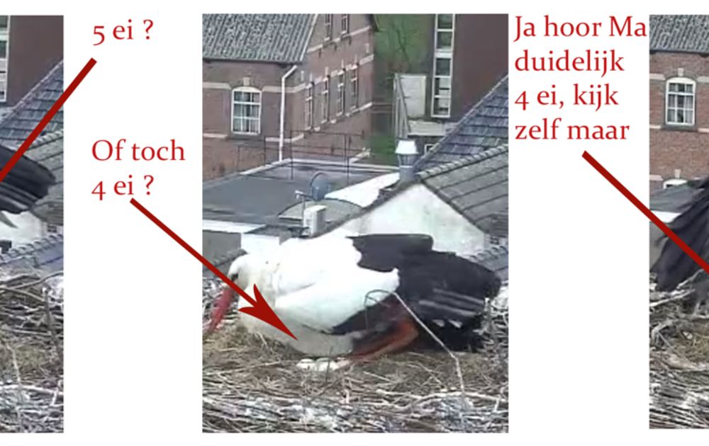 Pak je de screenshots die ik bovenin heb geplaatst dan zie je met daglicht (ook met IR licht) dat de eieren wat overbelicht worden (zie foto links) . Kijk je zodra een van de ooievaars gaat zitten, net voordat die zit, dan valt er schaduw op de eieren en zie je ze veel beter (foto midden) en nog wat beter op de foto rechts. De foto rechts heb ik uitvergroot en daar zie je toch duidelijk 4 eieren.