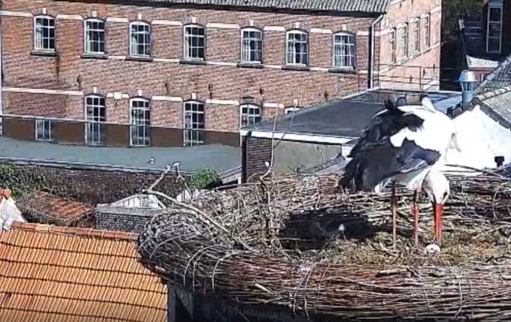 Ma was erg onrustig zondag avond en bleef maar gaan liggen en staan en bladeren en hooi om haar heen drapperen. Dan weer gaan staan en in het nest pikken en weer gaan liggen, staan enz. Dit zijn dus tekenen dat er wat te gebeuren staat en dat gaf ik zondag avond in de chat al aan. Ik heb nog met Durske een poosje gechat en toen gebeurde het. Potverdorie nog aan toe zeg. . . . . . storing, de Hop in beeld. Balen en nog eens balen zeg, net nu op het moment suprême, komt die hop in beeld. Mijn eerste gedachte, sodemieter op Hop, maar nee hoor, die bleef nog en toen ben ik maar gaan slapen rond 0.20 uur.  En dan de morgen erop lees je éérste ei ooievaar, balen zeg. De beelden terug kijken ging ook niet, want die zijn door de storing niet opgeslagen. Maar als ik de overige beelden ervoor en erna bekijk, moet het ei rond de 0.20 uur gelegd zijn, want daarna lag Pa op het nest en toen die opstond lag er een ei. Dus dubbel balen zeg !! Zie ook de mooie en mooi betitelde clip Ei.....ndelijk van Jan-Willem