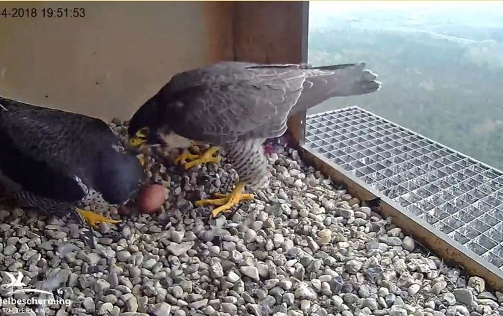 Ze slaapt staande met eerst het eitje tegen haar buik. Later neemt ze weer wat meer afstand van het eitje. Een nacht vol poetsonderbrekingen volgt. ’s Morgens om zes uur laat ze haar sirene weer horen, teken voor M om in actie te komen. Hij serveert het ontbijt op het rooster. NV mantelt het eitje voor hem af, wat is dat nu? Moeten we dit nu zien als teken dat ze toch binding heeft met het eitje? Het blijft een vraag, ze gaat er snel met het ontbijt vandoor. Hevig krijsend plukt ze de veren van het prooitje, ze dwarrelen van de dakrand naar beneden. Een paring volgt, hoort bij het ochtendritueel, weten we inmiddels. Daarna verdwijnen ze beide uit beeld, tot ver in de middag NV al etend op het dak wordt gesignaleerd. M neemt de zorg voor hun ei ter hand, want NV vertikt het vooralsnog. Als ze ’s avonds in de kast komt, doet ze ons nog even verstelt staan. Zien we werkelijk vorderingen, of fopt ze ons? Naast dat opvalt dat het geel van haar poten, snavel en oogranden prachtig felgeel is, lijkt ze aan het huishouden te slaan. Ze inspecteert alle hoeken van de kast, ze verplaatst steentjes … ze kuilt … en ze zijgt neder óp het ei! Ze zit zomaar op het ei! Op oma’s wijze, volgens grootmoeders recept, zit ze gewoon op dat ene ei. Zou ze nu dan toch gaan broeden? Nah, toch maar niet, na een paar uur staat ze op, gaat met haar rug naar het eitje zitten en gaat slapen.