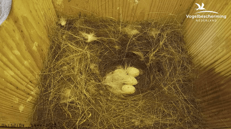 Hierna konden we gaan speculeren. Zou vrouw pimpelmees vanaf nu elke dag een ei gaan leggen, of zou ze het op om de dag gaan houden? Op woensdag zagen we ei nummer 3 in het nest verschijnen en vanochtend ei nummer 4. Het lijkt er dus op dat er vanaf nu elke dag een ei gaat komen, maar het blijft natuurlijk een verrassing. Deze vier eieren heeft ze steeds tussen 6.20 uur en 6.45 uur gelegd, dus we verwachten dat ze dit tijdschema blijft volhouden. Pimpelmezen leggen gemiddeld 7 tot 13 eieren per legsel, dus we hebben nog heel wat eieren te gaan voordat vrouw pimpelmees met het broeden zal gaan starten. We blijven kijken.