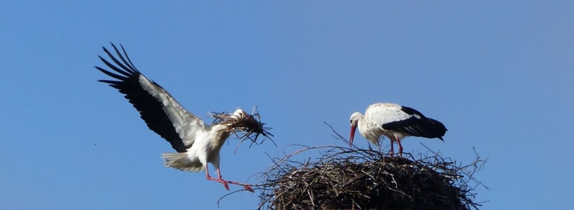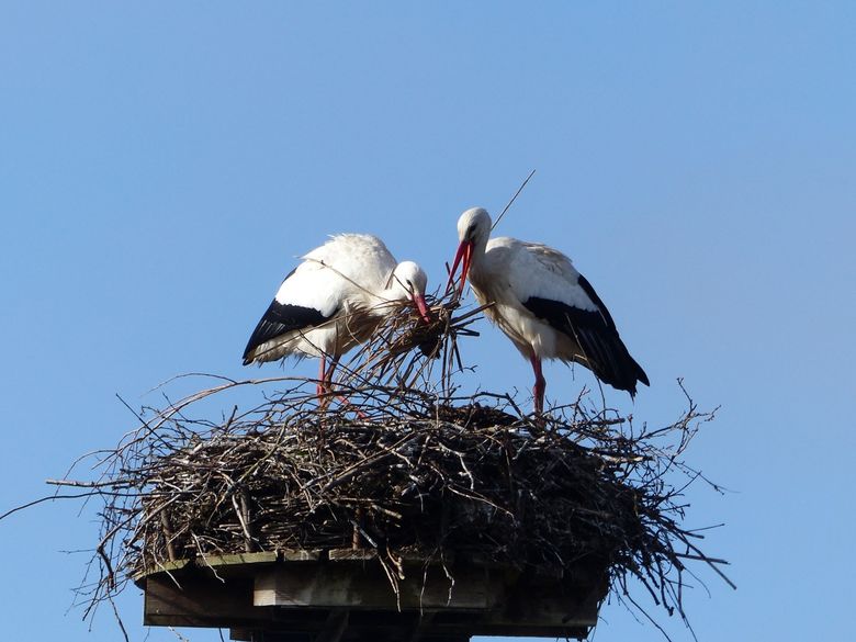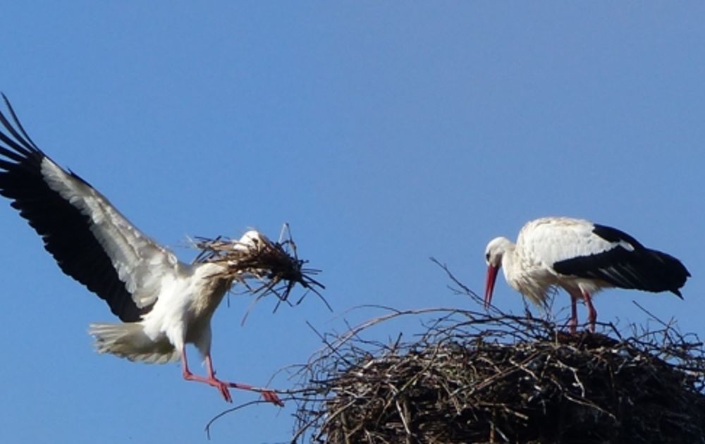 man en vrouw al weken druk met klepperen en het opknappen van het nest. Samen proberen ze de aangesleepte takken in het nest te vlechten, ze rommelen net zolang tot de tak goed zit of ..... naar beneden is gevallen. Met riet en graspollen wordt een zachte voering aangebracht. Zo wordt het nest opgeknapt na een winter met wind, regen, hagel en sneeuw. Overduidelijk is het ook bij hen lente!