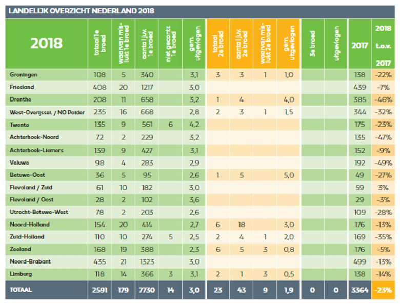 Elke regio (op Flevoland-Zuid na) ervaarde een daling in het aantal broedgevallen ten opzichte van 2017. De droge zomers van 2018 waren funest voor de muizenstand en dus het aantal broedgevallen van de kerkuil. Door de geweldige muizenstand dit jaar zullen de gegevens van 2019 er hoogstwaarschijnlijk rooskleurig uit gaan zien.