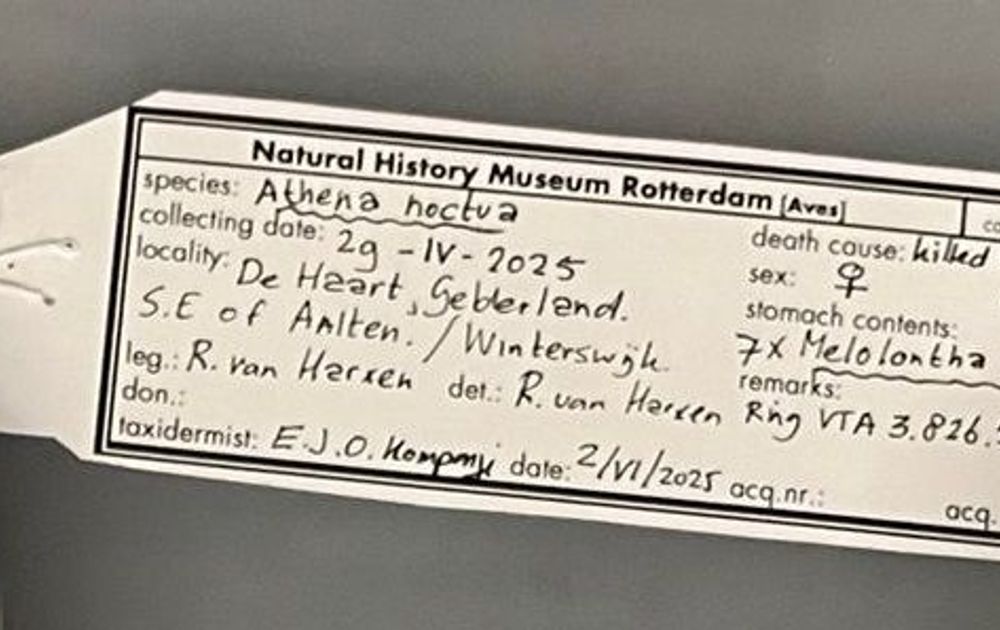 Op het etiket (zie foto in de kop van dit artikel) dat aan de poot van de uil bevestigd is, staan o.a. de vinddatum en -locatie vermeld, de sexe (vrouw), age (leeftijd): 7 + jaren, de death cause (doodsoorzaak): killed by Tawny owl) en de stomach contents (maaginhoud): 7 x melolontha melolontha (meikever) alsmede de namen van de schenker en de preparateur.
