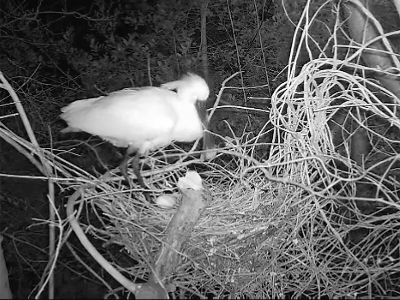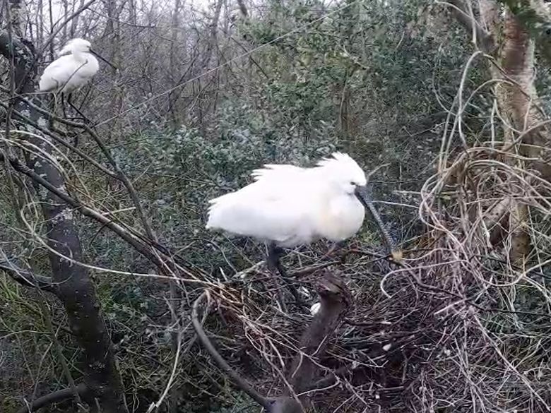 Waar even later met enige onzekerheid een eerste ei werd gemeld. Opvallend vroeg. De lepelaarbloggers hadden nog niet eens een vreugdevol ei-blog klaar staan! (Ze zitten zich momenteel het hoofd te breken of ze nú al beschuit met muisjes mogen smeren, of dat ze moeten wachten tot het ei is uitgekomen.)