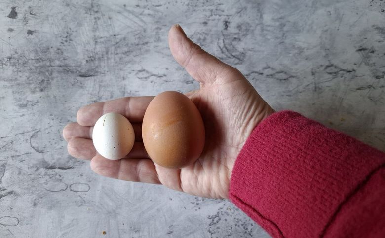 Om even een beeld te geven van de grootte van het ei van een steenuil heb ik even een oud steenuilen-ei uit de collectie gepakt, deze was niet uitgebroed. Daarnaast ben ik even mijn koelkast ingedoken voor het ei van een kip. Voor de vergelijking, zie de foto hieronder.