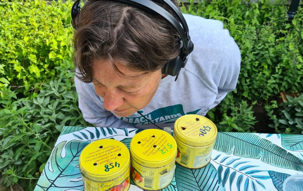 Met Merlijns neus bleek niets mis. Feilloos wist ze die eieren te kiezen die de meest onwelriekende geur verspreidden. Toen we die uit het blikje haalden en de eerste ervan openden vulde de welbekende rotte eieren lucht ogenblikkelijk onze neusgaten. In het ei geen embryo maar een blauwgrijze drab die er net zo smakelijk uitzag als hij rook. Gelukkig was het prachtig weer en stonden we buiten. Nadeel daarvan was wel dat niet alleen onze neusgaten gevuld werden, maar ook die van talloze groene vleesvliegen. Hun reukorgaan is onovertroffen; van kilometers ver ruiken ze 'lekkere' luchtjes. Lijkenlucht ruikt voor hen waarschijnlijk zoals vers gebakken appeltaart voor ons: onweerstaanbaar.. Als aangetrokken door een magneet stortten ze zich op de lekkernijen. Met hun zuigsnuitjes als rietjes bleken ze vooral geinteresseerd in het dunne eiwit. Op het eind van de ochtend zaten er regelmatig honderden zij aan zij rondom een eiwitplas, als mini-olifanten rond een opdrogende drinkplaats. Om niet-uitgekomen eieren te onderzoeken, moet je beslist geen vliegangst hebben, merkte Pascal gevat op.
