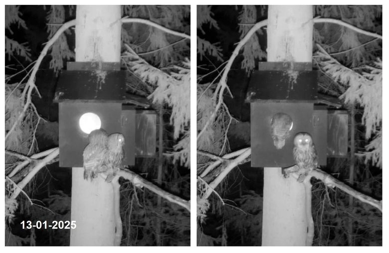 Ik lees onze groepsapp even terug. We lezen begin januari. Jan laat weten dat het opmerkelijk stil is rondom de kast. Verderop worden de uilen nog wel eens gehoord, maar opmerkelijk weinig. Maar medio januari: Ja! Een uil wordt duidelijk gehoord. We bekijken met enige spanning bekijken we de beelden uit de kast… “Is daar wat verschoven op de bodem?” Het is lastig te zien. Maar de volgende nacht verschijnen er twee uilen voor de kast. Hèhè, eindelijk.. Onze euforie is van korte duur. Na deze ene nestkast inspectie hebben we de uilen niet meer bij de kast gezien. Waar zijn ze heen?