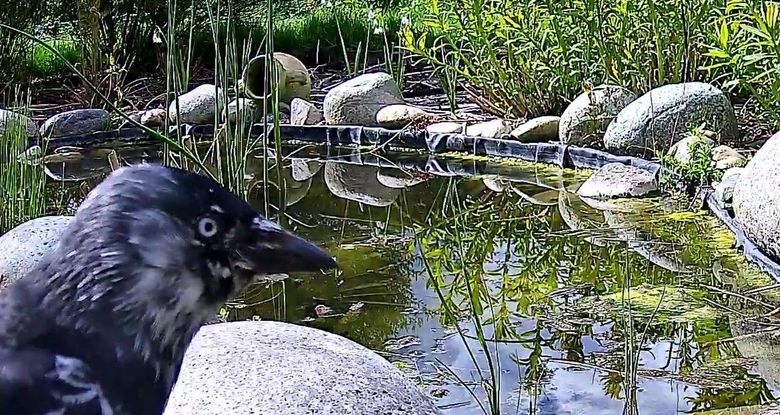 De dieren die jullie hier horen en zien, verschillen wat van de bosvijver. De afgelopen dagen zie je de meer voorkomende vogelsoorten, zoals kauwen en duiven. We hebben ook vele andere vogels, maar die laten zich nu even niet zien. De een is druk bezig met nestjes en heeft weinig tijd voor baddermomenten. De ander zoekt onze tuin pas op als we weer hun favoriete vruchten hebben hangen aan de bomen. Nu is de begroeiing nog wat te laag voor sommige vogelsoorten, maar over een maand is het weer een stuk groener.