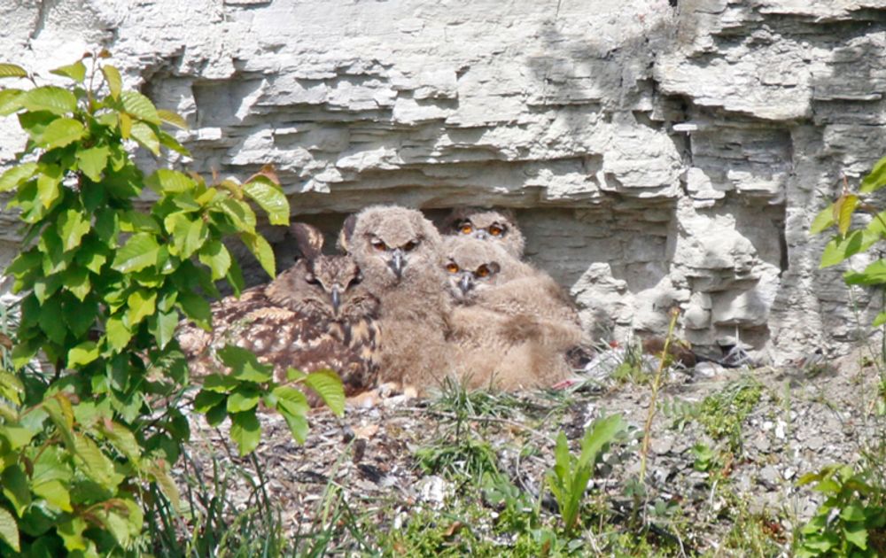 Op 5 mei werden de 3 jonge oehoetjes in de Winterswijkse groeve geringd. Ze werden door de klimmer meegenomen naar de bodem van de groeve. Daar werden de 3 bandietjes geringd. Het bleken 2 mannetjes en 1 vrouwtje van 32 t/m 36 dagen oud. Het vrouwtje van 36 dagen had toen al een gewicht van zo’n 1600 gram! Het berekende broedbegin ligt daar in Winterswijk dan rond 24 februari.