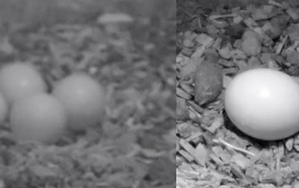 Als de verwachting voor Dongen uitkomt, zouden we in de loop van de dag het eerste gepiep uit het ei moeten kunnen horen. Altijd een heel bijzonder moment, Anjo schreef er gisteren al over. Als dat gebeurt terwijl het vrouwtje aanwezig is, let dan ook eens op de tokkelende geluidjes die het vrouwtje maakt. Zij 'praat' echt terug tegen het piepende ei. Voor het jong in het ei zijn dat heel bemoedigende geluiden. Zoiets als: de kust is veilig, kom maar tevoorschijn! Het is niet bekend wanneer een opgroeidend embryo voor het eerst geluiden uit de omgeving opvangt, maar in de laatste dagen voor het uitkomen zal dat zeker het geval zijn. Dezelfde geluiden maakt het vrouwtje in de dagen na de geboorte. Dat klinkt het kuiken dus van meet af aan bekend in de oren. Het signaal dat het op de goede plek is uitgekomen. Een schoolvoorbeeld van interne communicatie!