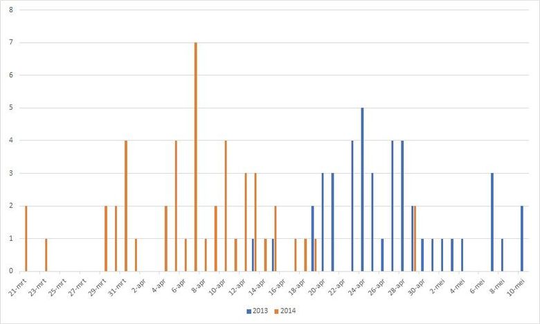 De jaren zijn bijna elkaars spiegelbeeld. In 2013 werd bij veruit de meeste nesten het eerste ei pas na half april gelegd, in 2014 was dat precies andersom. Waar 2022 op gaat uitkomen, laat zich lastig voorspellen. Daarvoor moeten we wat verder in het seizoen zijn als we aan de hand van de leeftijd van de jongen de legselstart kunnen berekenen.