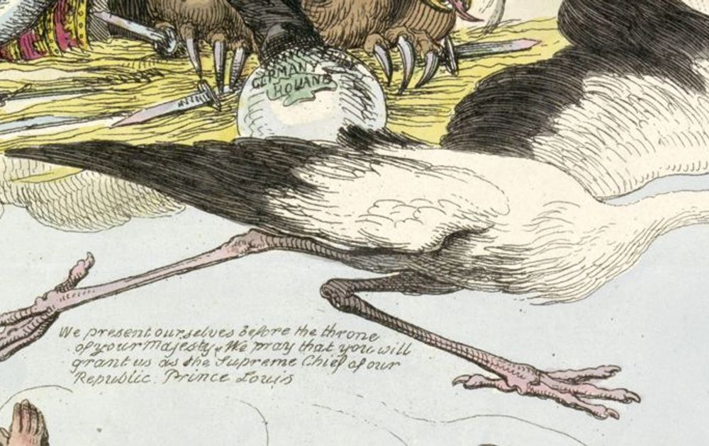 Een spotprent is meer dan een aardig plaatje. Het is satirisch bedoeld en bevat een boodschap. Op deze prent is Napoleon afgebeeld als oppergod Jupiter Bonney, wat goed past bij zijn grootheidswaanzin. Hij stuurt zijn broer als ooievaar naar Holland, als hun nieuwe koning, een cadeautje. De Hollandse kikkers aanvaarden het nederig en in grote dankbaarheid. Wat ze niet beseffen is dat Koning Ooievaar hen moet onderdrukken en opeten. Althans, dat is Napoleons bedoeling.