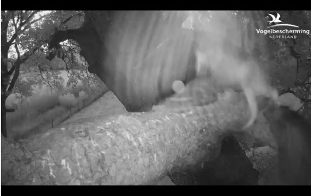 Het ging razendsnel, zelf de 10 keer vertraagde beelden geven geen uitsluitsel.Een groot deel van de avond verbleven ze alle drie in kast om rond 22.00 uur naar buiten te komen en een voor een de schemering in te vliegen. Nummer drie vertrok 10 seconden voor het gebeuren zich afspeelde. Of hij het was die gepakt werd? We zien in ieder geval van links een jong op de tak landen, misschien in een vertwijfelde poging de veiligheid van de kast op te zoeken. Hij krijgt de kans niet, want vrijwel gelijktijdig wordt hij gegrepen door de klauwen van wat wel een bosuil moet zijn. Beide verdwijnen vervolgens rechtsonder uit beeld, onder de tak door.