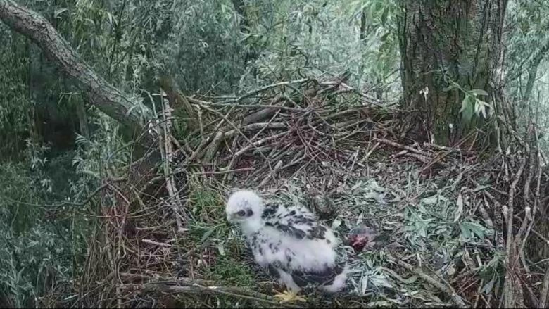 Wanneer we naar de webcam kijken zijn we er inmiddels al aan gewend dat het havik kuiken het grootste deel van de dag alleen is. Nieuw (en mooi) is dat papa nu zelf de prooien mag brengen! Dit is echter wel van korte duur, aangezien hij iedere keer zeer snel is vertrokken.