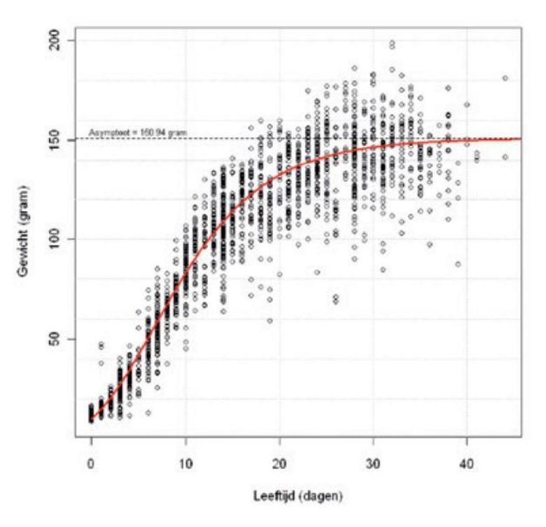 Zou je de gewichtsontwikkeling in een grafiek weergeven, dan krijg je de figuur hierboven. Elk rondje staat voor een individuele meting van een jong met bekende leeftijd. De rode lijn geeft de gemiddelde gewichtsontwikkeling weer. Deze zogenaamde groeicurve hebben we jaren geleden gemaakt en gebruiken we sindsdien om de conditie van een jong te bepalen. Ongeveer zoals op het consultatiebureau het gewicht en de lengte van een baby vergeleken worden met het gemiddelde en u het advies krijgt dat er wel een flesje pap minder in mag. Of juist eentje extra.