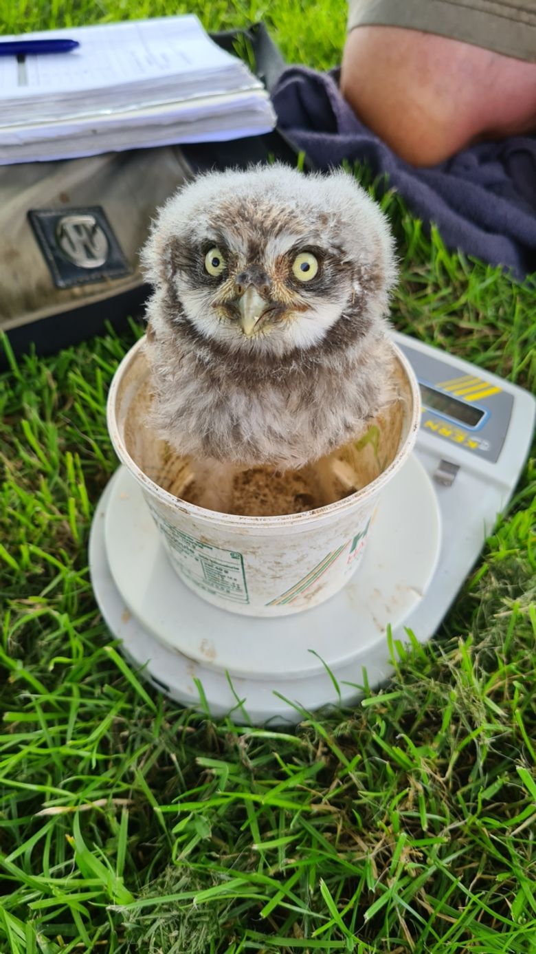 Dat aankomen gaat de komende week gewoon door. Tussen de dag 12 en 13 wordt doorgaans al de 100 gram aangetikt. Daarna vlakt de groei enigszins af. De 150 gram wordt pas rond dag 40 bereikt en dan hebben de meeste jongen wel zo'n beetje hun maximum bereikt. In muizenrijke jaren willen ze daar nog wel eens een schepje bovenop doen, maar van de vele duizenden jonge steenuilen die we de aflopen 37 jaar gewogen hebben, heeft er niet een de 200 gram gehaald.