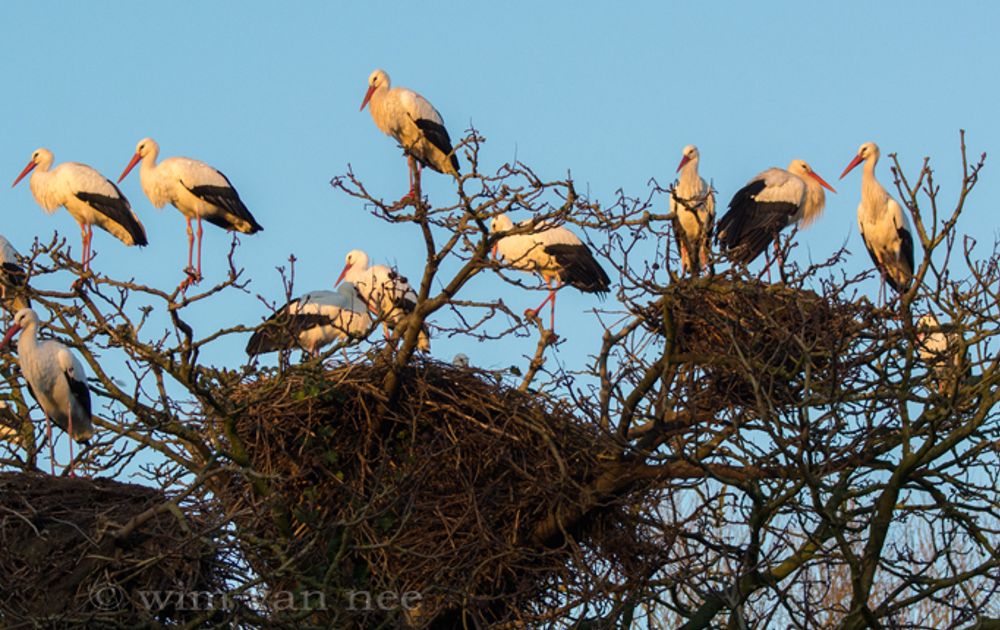 Ik laat u graag de foto hierboven zien van een boom vol ooievaars. Zo'n foto kan nog net, omdat dit een beeld is, dat alleen in de trektijd gemaakt kan worden. Dan zijn ooievaars in groepsverband te zien.