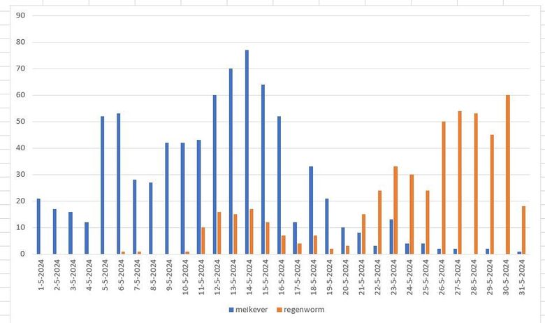 Steenuilen op de zandgronden in het oosten zuiden van het land hebben het grote voordeel dat daar grote aantallen meikevers rondvliegen. Zonder deze vormen alleen larven en rupsen het alternatief voor regenwormen. We zien dat perfect terug in de figuur hieronder die de aanvoer van meikevers en regenwormen vanaf de geboortedag van jonge uilen laat zien. Waar de aanvoer van de een stokt, neem die van de ander toe. Maar wat als er behalve geen muizen, ook geen meikevers waren geweest?