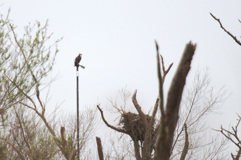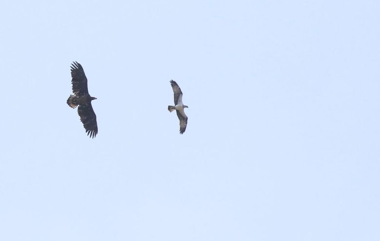 Ondertussen geeft hij het niet op. Hij bouwt rustig door, brengt veel tijd door op en rondom zijn nest en vangt geregeld een vis. Gezien zijn ervaring met ganzen lijkt hij het nest nu vaker te bezoeken. Vaak zit hij op een tak naast het nest of zelfs op de camera! Nadat de ganzen het opgaven, heeft de man visarend nog hard zijn best gedaan om alsnog zijn dame te vinden. Met een vis in zijn poot, hoog opvliegend, baltste hij erop los. Luid roepend maakte hij grote rondes door de Biesbosch maar het heeft niet tot resultaat geleid. Ondertussen heeft zijn baltsgedrag met een vis de aandacht getrokken van een derdejaars zeearend. Als een grote jager die achter een stern aanzit, probeert hij de vis van de visarend te bemachtigen. We zien het inmiddels bijna dagelijks.