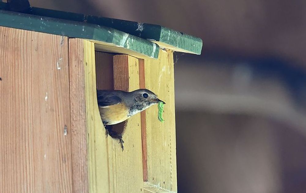 Nou, dat is nou juist een van de problemen. We hebben het begin gemist van dit stelletje en hun nestje. Toen we, per ongeluk, de camera een keer wilden controleren, bleek er al een vrouwtje op het nest te zitten. Diep in het nest gedoken, maar we wisten toch al snel dat het een roodstaart was. Maar een gekraagde of een zwarte? Want we hadden ze immers allebei op ons erf gehoord en gezien. Toen ik haar uiteindelijk op de foto kreeg was dat raadsel opgelost; dit was zonder twijfel een vrouw gekraagde roodstaart. De foto stond al in mijn eerste blog, maar voor het gemak zet ik hem hier nog een keer bij.