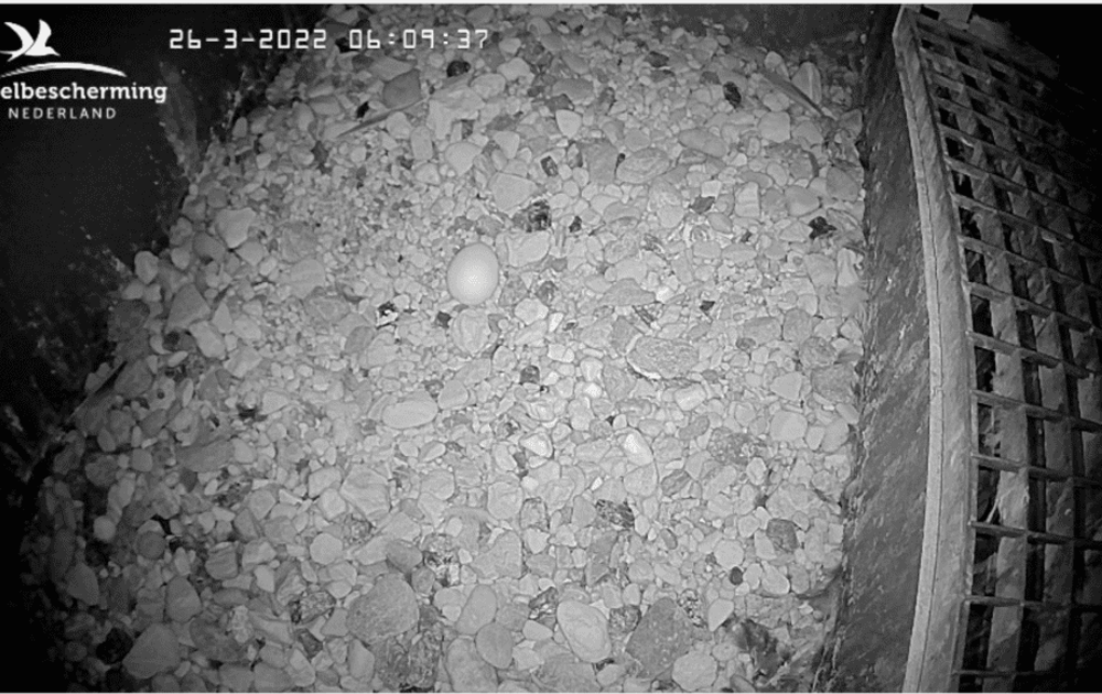 Het ei wordt nog niet bebroed. Beide ouders broeden straks en zullen er nu soms op gaan liggen maar dat is nog geen broeden. Dus geen zorgen, het ei mag gerust alleen liggen. Over hoe dat gaat met het broeden in een later blog meer.