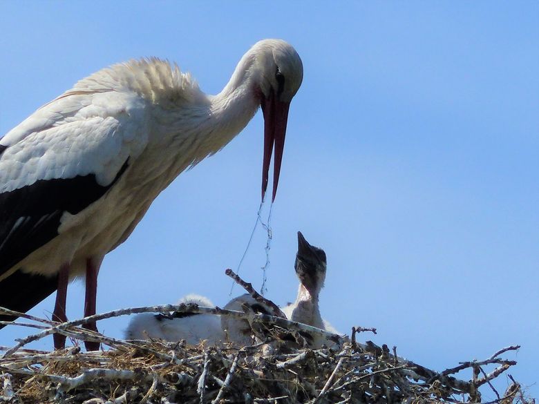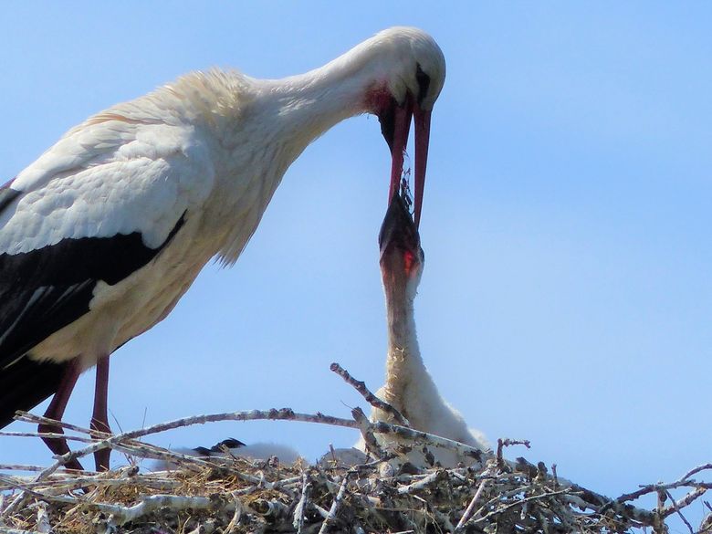 Dat lukt niet altijd, maar elk kuiken krijgt toch wel een paar slokken binnen. En dat is meer dan welkom, als ooievaarskuiken zit je anders wel heel hoog en droog.