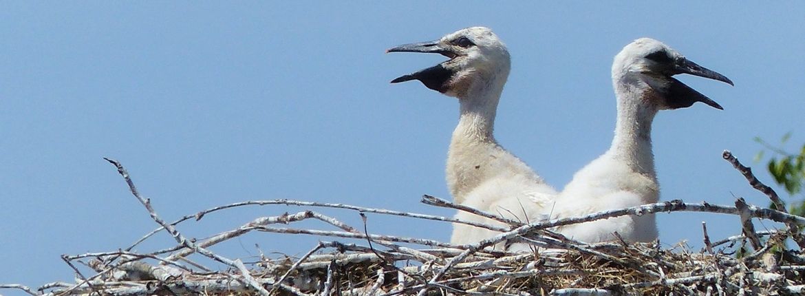 Bij zulke warme dagen proberen de ouders en de jongen op het nest nog een beetje warmte kwijt te raken door met de snavel open te zitten. Zweten kunnen ze niet met hun verenpak. Maar of het veel helpt?