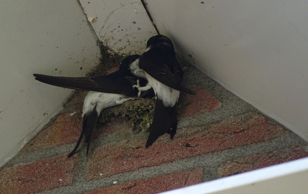 Het vrouwtje bouwend in het kommetje, man druk met het aanslepen van bolletjes klei en bagger, stukjes gras en stro worden er doorheen geweven als een stevige bekisting. Hoeveel keer zal hij heen en weer gevlogen zijn? Het bouwproject duurde twee weken en dat leverde een aandoenlijk vertederend plaatje op. Daar zaten ze dan, samen tijdens een fikse bui in een half afgebouwd nestje, schuilend voor de regen. Zo lief, kopjes bij elkaar. Inmiddels is het nestje klaar, een waar kunstwerk en zijn ze aan het broeden.